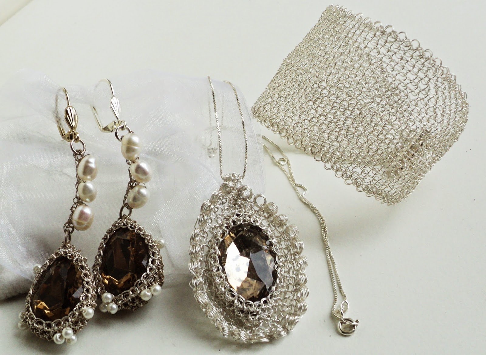 en plata, de brazalete, aros y colgante. Con cristales y perlas de rio.